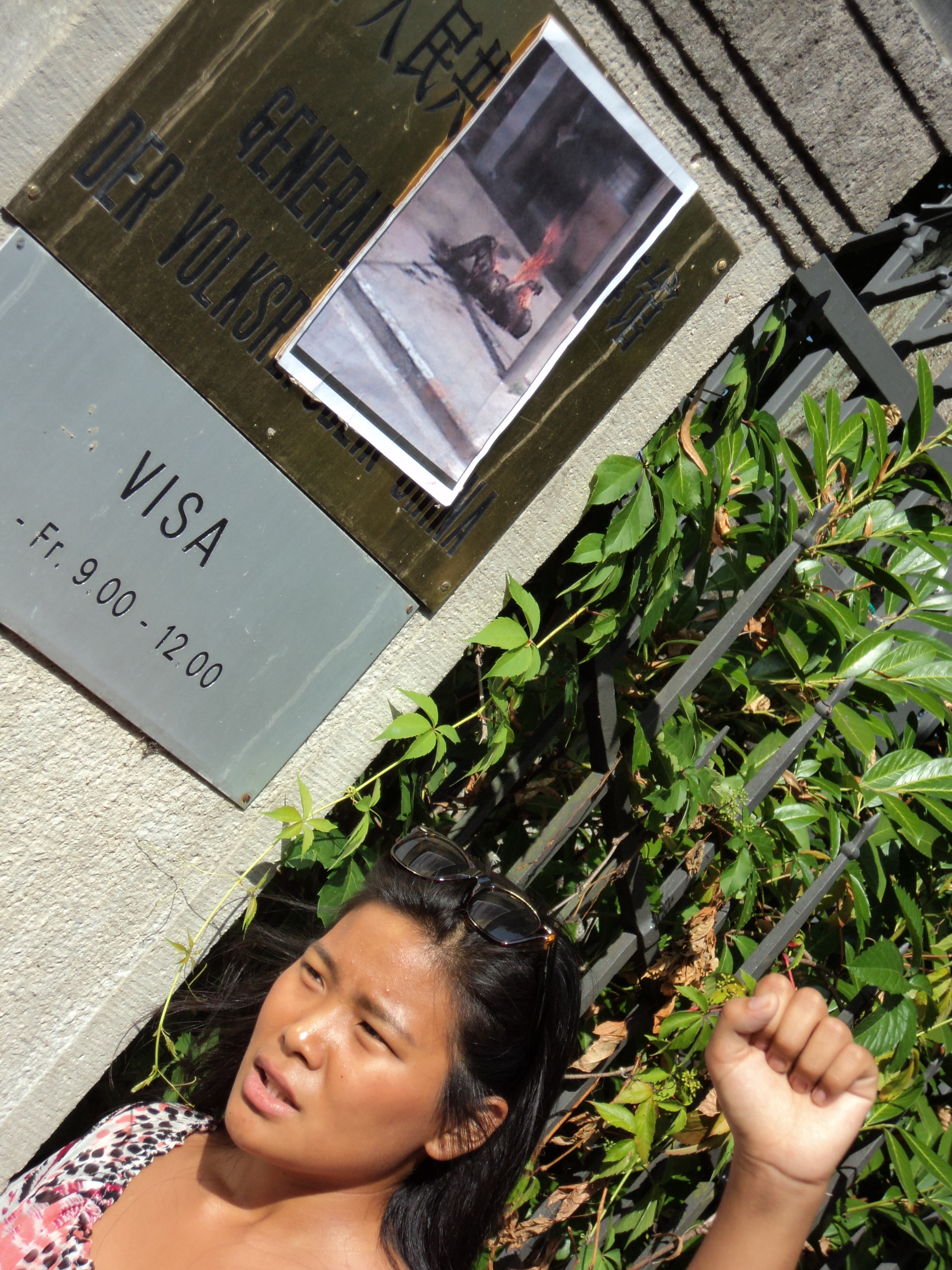 Afterwards on Facebook I saw so many pictures of all the actions that were taken all over the world to show the feelings of exiled Tibetans about this tragedy. I was especially inspired when I saw Karma and Sonam’s action (the girls I got to know at Free Tibet! Action Camp in Düsseldorf just few weeks ago!) in front of the Chinese embassy in Manchester. They pasted a picture that showed Tsewang Norbu burning to the signboard of the Chinese embassy. I thought, “Wow this is such a simple thing and it is effective, because it hurts the Chinese government – not too badly or economically– but it hurts their image and this is the only thing that counts.”