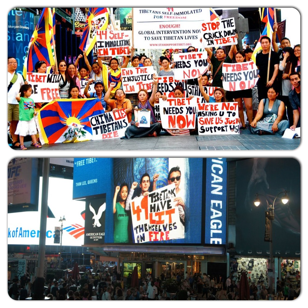 On July 25th 2012, led by SFT intern, Lhakar was organized for the first time in Times Square to raise the awareness of 49 self-immolations in Tibet under the ruthless policies of China. Times Square is one of the most attractive spots, roughly 1.6 million pass through this area daily according to an online source. Our event was short (5-7pm) but it has been very sweet and a great success. Most of the people did die-in action symbolism of self-immolators in Tibet at the face of the famous red stair. The participants covered themselves with a Tibetan national flag, to show respect. There were some people who patiently carried the banners with message on while one of the intern verbally explaining what was going on. At the same time, few youngsters were asking for petition signatures for global intervention while some of elders were distributing flyers. Few of us technically appeared in the huge American Eagles billboard with various slogans of crises inside the Tibet. Within two hours, I felt like we made this place louder, more active. More importantly, the tourists who visit Times Square that time not only must have felt the beauty of it but also they became aware about sufferings inside Tibet. Here is what I wrote on my facebook status that evening “We were able to glue eyes of many people on Tibetan issue thru Today’s Lhakar vigil in Times Square; two young ladies eagerly asked me “how they can help our Tibetan cause?” Even cops approached me and asked what is going on inside Tibet? Instead of asking for sounds permits!”