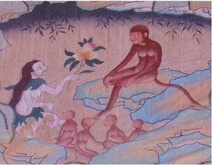 According to Gyatso, this isn’t the first time Srin is referred to as mo, female. In the Tibetan myth of the copulation between a compassionate monkey and a lustful rock ogress, which brings about the birth of the first Tibetan, Srin is portrayed as mo. In this myth, the monkey is portrayed as the male Avalokitesvara and Srin as the female rock ogress (44). Although Srin is portrayed as mo in both of the myths, whether Srin is in fact female is unclear due to a lack of sources from pre-Buddhist Tibet. For David Paul, the feminization of Srin in the Buddhist cannon may have something to do with how Buddhists of that time viewed women. Women according to Buddhists of that time were associated with desire and attachment, which was seen as dangerous and threatening to the celibate Buddhist monk (44).