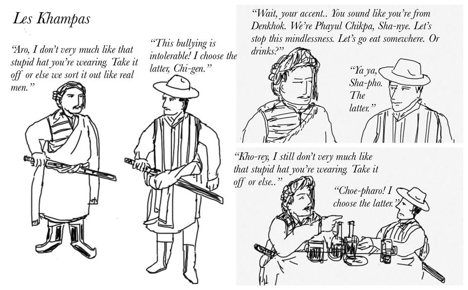 Then there is laughing at oneself. I encountered this notion when I recently did another cartoon featuring two Khampa men. This time I was less interested in the geographical or historical setting but more in the ‘Khampa-ness’ of my two characters. Certainly, this is a subject that extends well beyond the scope of mere cartoons. I just tried scratching the surface and guess what I found? Contradiction and swear words.