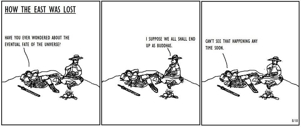 In 2012, I went to the Kalachakra at Bodhgaya and, afterwards, on a pilgrimage of several Buddhist sites in Uttar Pradesh and Bihar. Instead of inspiring any profound religious sentiments, those travels pushed me into musings about a nice cup of chai. At Varanasi, I had the best cups of chai in my life and I ended up doing a cartoon about it: