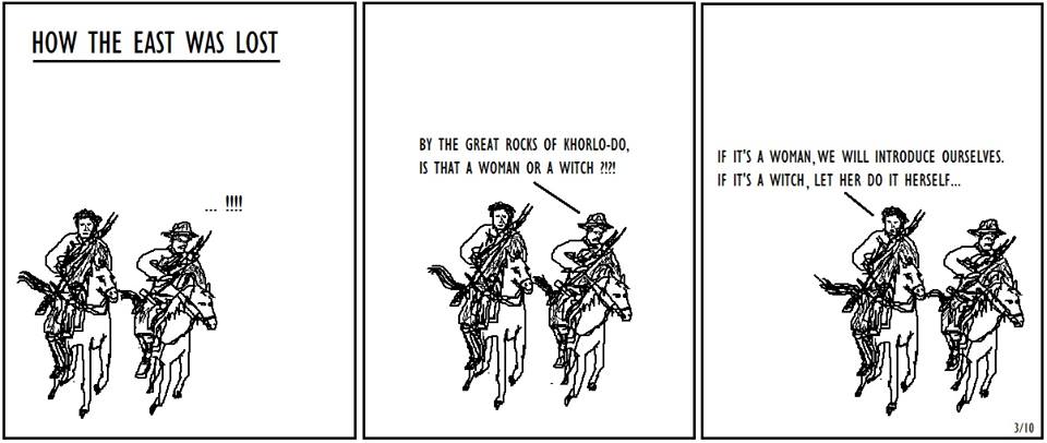 One of my first series of cartoons in 2011 was based on my imagining of two Khampa men traveling around on their horses, far removed from law and civilization. I equipped them with swords and primitive rifles (called ‘bhura khadhong’ in my Dege dialect) and set them upon a land filled with bandits and ghosts. Also, at that time I had watched ‘Butch Cassidy and the Sundance Kid’ which may have influenced the dynamics between my two Khampas.