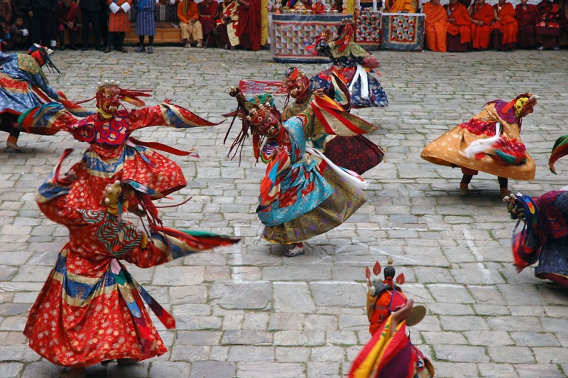 Among the many meanings accorded to cham, the ritual is a dance that reenacts the heroic story of Padmasambava (Guru Rinpoche) in Tibet, the revered tantric teacher from Swat Valley (in modern day Pakistan) who came to Tibet at the invitation of King Trisong Detsen. Padmasambhava is credited with taming the deities of the Tibetan landscape and helping to spread Buddhism across the plateau. Beyond its historic retelling of Padmasambhava, cham is also a public ritual performed every Tibetan New Year for a variety of purposes too numerous to list here.