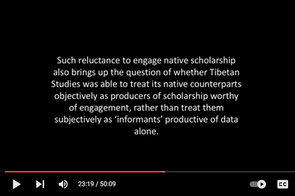 The lecture is over 45mins. For those who don’t have patience or time for the full lecture, I made the following list for easy listening. The essay is broken in sections based on chronology. Each section looks at how Tibet/ans were represented by Tibetan Studies specialist during specific eras. Each section has its own title. I have listed the titles below with time stamps so viewers can easily go to sections they find most interesting.
