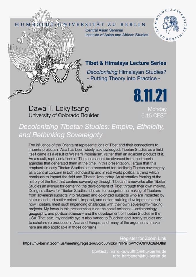 Lokyitsang, Dawa. 2021. “Decolonizing ‘Tibetan’ Studies: Empire, Ethnicity, and Rethinking Sovereignty.” Lecture for Humboldt-Universität zu Berlin’s Decolonising Himalaya Studies- Putting Theory into Practice lecture series. University of Humboldt-Universität zu Berlin. November 8th, 2021.