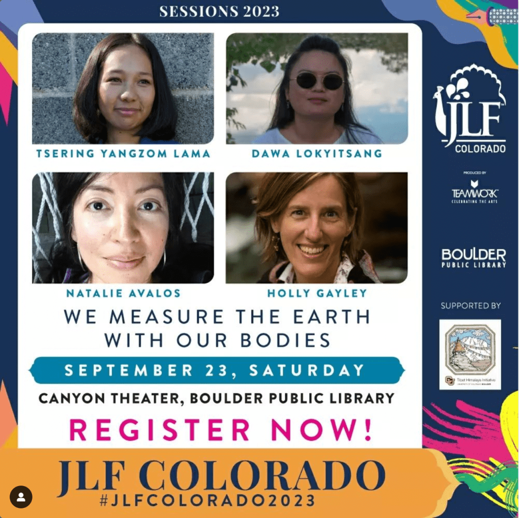 This conversation titled “Tsering Yangzom Lama and Dawa Lokyitsang in conversation with Natalie Avalos, introduced by Holly Gayley” took place at the Jaipur Literature Festival in Boulder, CO on September 23rd, 2023 to honor Tsering Yangzom Lama’s debut novel We Measure the Earth with our Bodies.