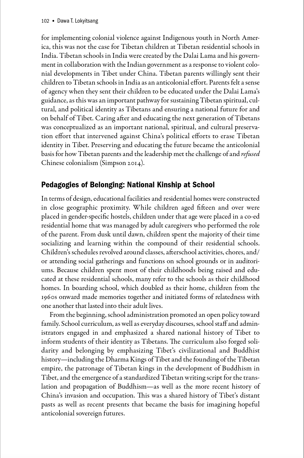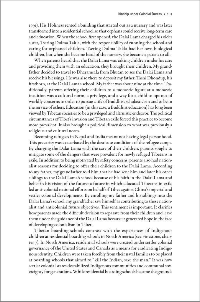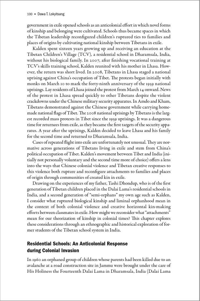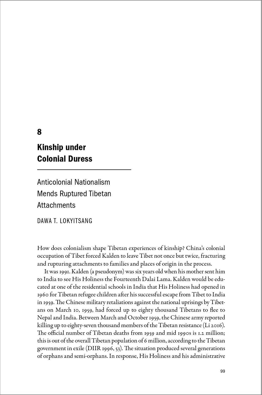 “How does colonialism shape Tibetan experiences of kinship? China’s colonial occupation of Tibet forced Kalden to leave Tibet not ones but twice, fracturing and rupturing attachments to families and places of origin in the process.”
